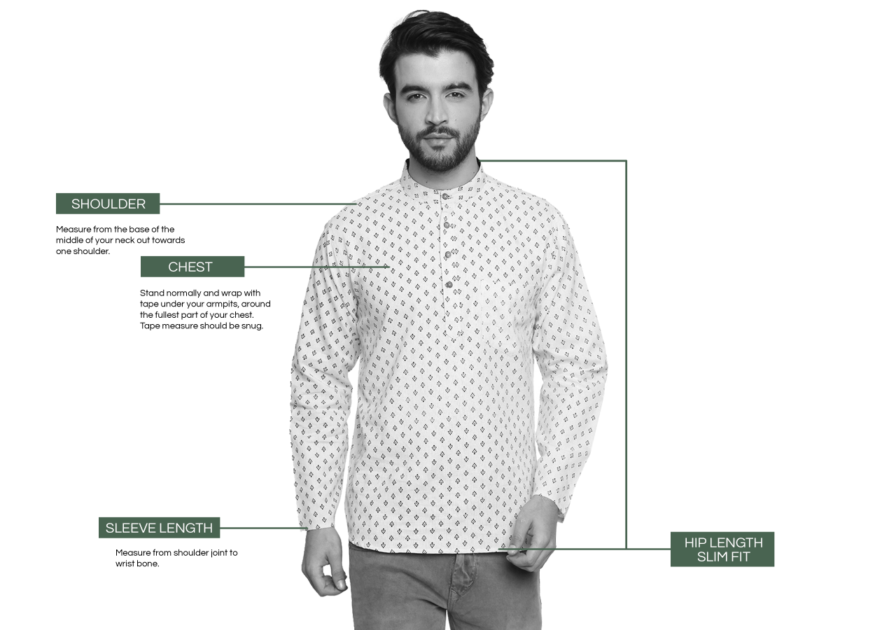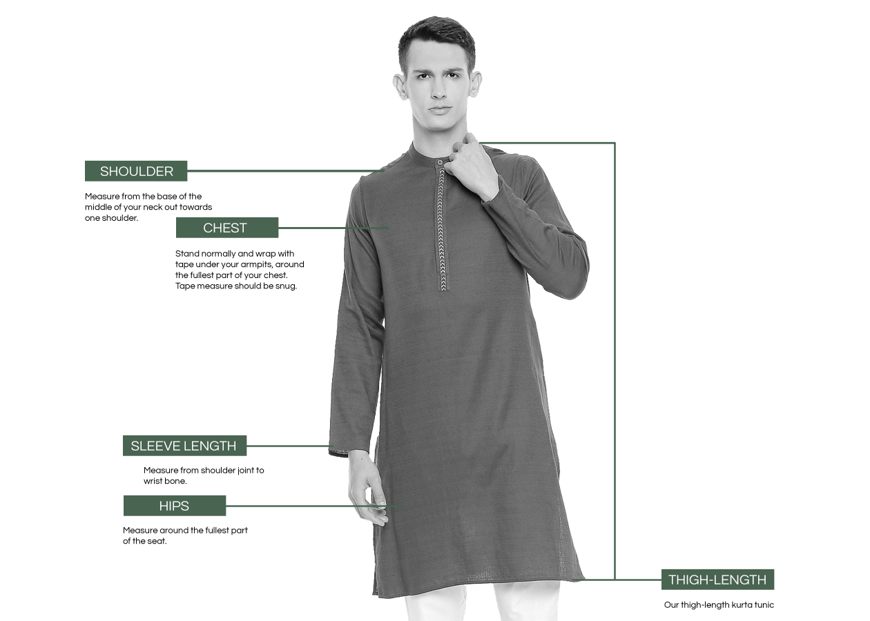 | Size (US) | Fits Chest Size | Fits US Dress Shirt Collar Size | Fits waist | Sleeve Length | Mid-Thigh Length Tunic (Actual Length of the Garment) | Knee Length Kurta Tunic |