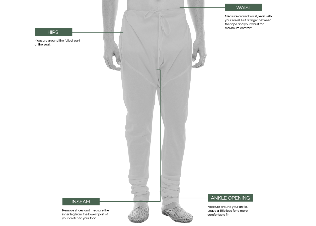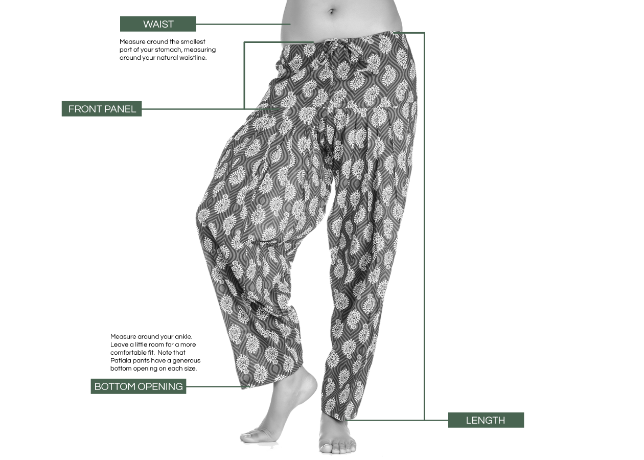 Important note: Patiala pants are made with many yards of fabric and are designed to flare out when they are worn. Because Patiala pants come with an adjustable drawstring, you can comfortably tie it around your waist or lower. Please measure around the area that you will be wearing your Patiala pants to ensure proper fit.