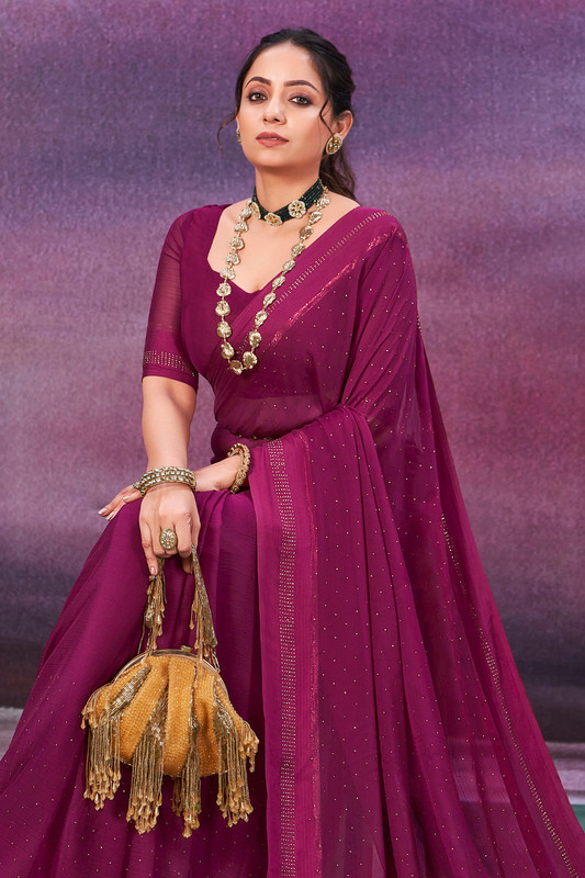 Our Silk Glam Saree is a luxurious design with an elegant sparkling effect. Crafted from silk, this magnificent Saree features a subtle glitter effect that will make you feel like a jewel. The accompanying blouse, made from Chiffon, features the same subtle glitter for the night’s festivities. With a generous length of 5.5 meters / 18 ft for the saree and 0.8 meters / 2.6 ft for the blouse, this ensemble offers ample fabric to drape gracefully. It also comes pre-packaged with an "unstitched" blouse cloth piece. This beautiful design is ideal for festive occasions like weddings, receptions, Diwali, Eid, holiday celebrations, and special gatherings.  Pair it with traditional jewelry, elegant heels, and In-Sattva's handbag for a complete, polished look that exudes grace and poise.